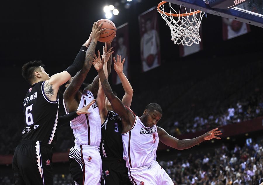 He Tianju (1st L) and Zhao Jiwei (2nd R) of Liaoning vie with Jarell Martin (2nd L) of Shenzhen during a match at the Chinese Basketball Association (CBA) League on Jan. 7, 2020. (Xinhua/Mao Siqian)