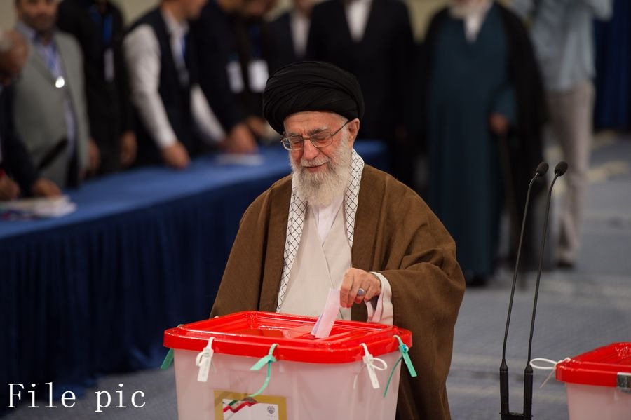 Iranian Supreme Leader Ayatollah Ali Khamenei casts vote in the presidential election at a polling station in Tehran May 19, 2017. Iran held the presidential election on Friday. (Xinhua/Meng Tao)