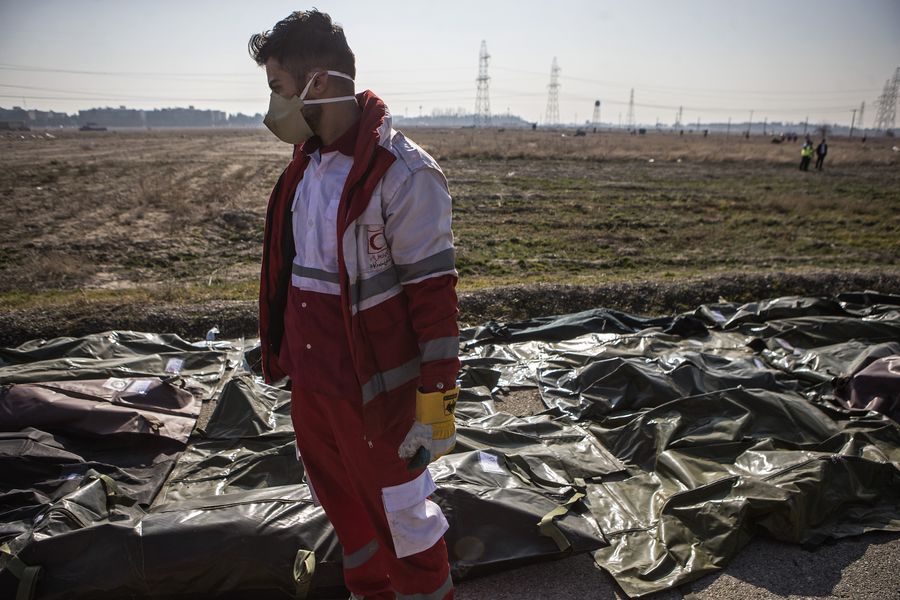 A rescuer stands beside the bodies of victims at the air crash site of a Boeing 737 Ukrainian passenger plane in Parand district, southern Tehran, Iran, on Jan. 8, 2020. (Photo by Ahmad Halabisaz/Xinhua)