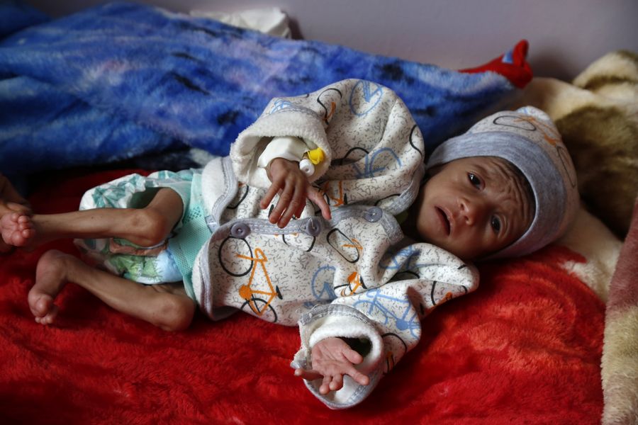 A malnourished child lies on the bed as he receives medical treatment at an anti-malnutrition ward in Al-Sabeen hospital in Sanaa, Yemen, Jan. 6, 2020. (Xinhua/Mohammed Mohammed)