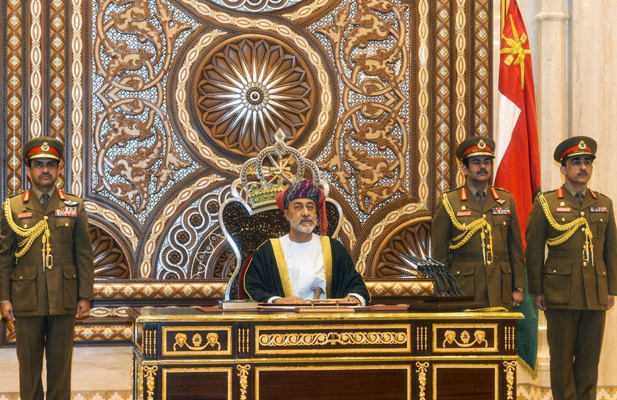 New Sultan of Oman Haitham bin Tariq al-Said attends his inauguration ceremony in Muscat, Oman, on Jan. 11, 2020. New Sultan of Oman Haitham bin Tariq al-Said said on Saturday that he will follow the steps and approach of the late Sultan Qaboos bin Said and will complete the progress achieved in the Omani renaissance process. (Xinhua)