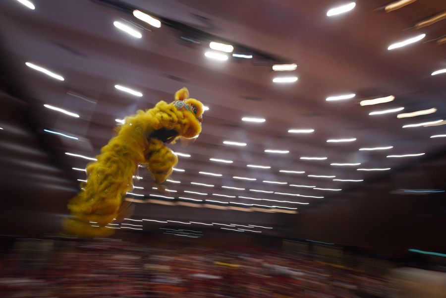 Lion dance performers compete in the 13th International Lion Dance Competition as part of the Chinese New Year celebrations held in Singapore's Chinatown, on Jan. 11, 2020. (Xinhua/Then Chih Wey)
