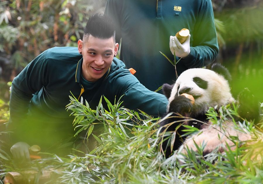 Team North's Jeremy Lin of Chinese Basketball Association (CBA) League All-Star game interacts with giant panda Longlong at Chimelong Safari Park in Guangzhou, south China's Guangdong Province, Jan. 11, 2020. (Xinhua/Liu Dawei)