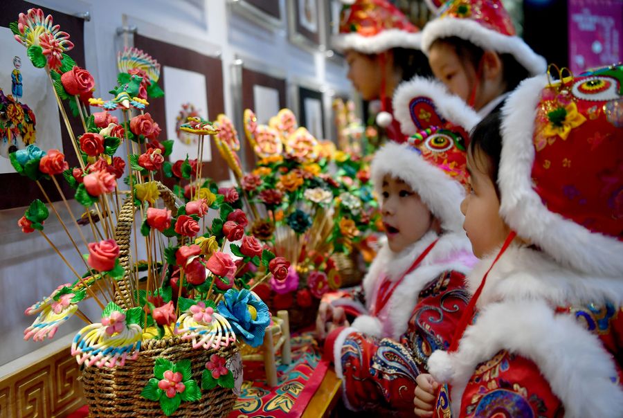 Children observe the traditional "flowery buns" during a Spring Festival folk art activity held in Xi'an, northwest China's Shaanxi Province, Jan. 10, 2020. An activity with the theme of "flowery buns", a dough food shaped in plants and animals, was held here on Friday to promote the folk art in central part of Shaanxi Province as the Spring Festival draws near. (Xinhua/Liu Xiao)