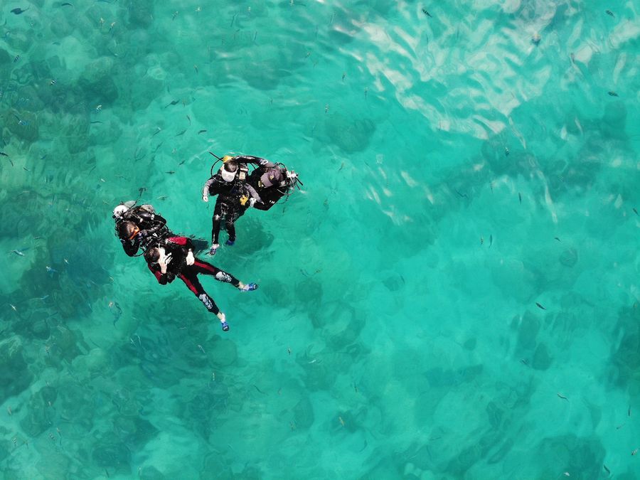 Aerial photo taken on Jan. 11, 2020 shows tourists experiencing diving at the Wuzhizhou Island in Sanya, south China's Hainan Province. More than 83 million tourists from home and abroad visited southern China's tropical island province of Hainan in 2019, up nine percent year on year. Hainan's tourism revenue went up 11 percent over the previous year to 105 billion yuan (about 15 billion U.S. dollars) last year, according to the provincial department of tourism, culture, radio, television and sports. (Photo by Zhang Liyun/Xinhua)