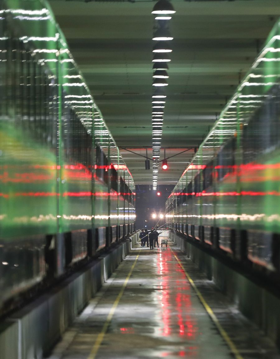 Mechanicians maintain a bullet train in southwest China's Chongqing Municipality late at night on Jan. 10, 2020. China, the world's most populated country, on Jan. 10 ushered in its largest annual migration, 15 days ahead of the Spring Festival, or the Lunar New Year. There will be three billion trips during the travel rush from Jan. 10 to Feb. 18 for family reunions and travel, slightly up from that of last year, according to a forecast from the National Development and Reform Commission (NDRC). (Photo by Huang Wei/Xinhua)■