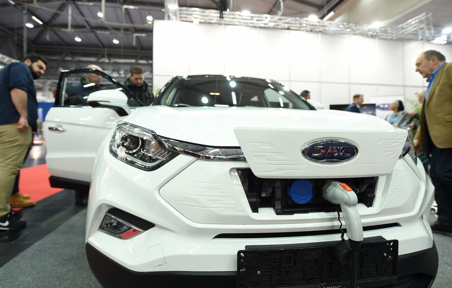 Photo taken on Jan. 16, 2020 shows an electric vehicle displayed at the exhibition area of JAC Motors during the Vienna Autoshow 2020 in Vienna, capital of Austria.(Xinhua/Guo Chen)