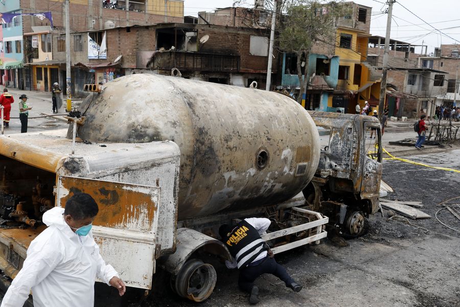 Police inspect a gas tanker after an explosion in the Villa el Salvador district in southern Lima, Peru, January 23, 2020. (Xinhua/Mariana Bazo)