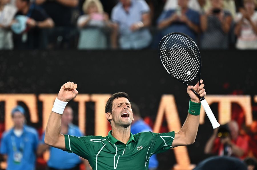 Novak Djokovic of Serbia celebrates after winning the men's singles semifinal match against Roger Federer of Switzerland at the Australian Open tennis tournament in Melbourne, Australia on Jan. 30, 2020. (Xinhua/Zhu Wei)