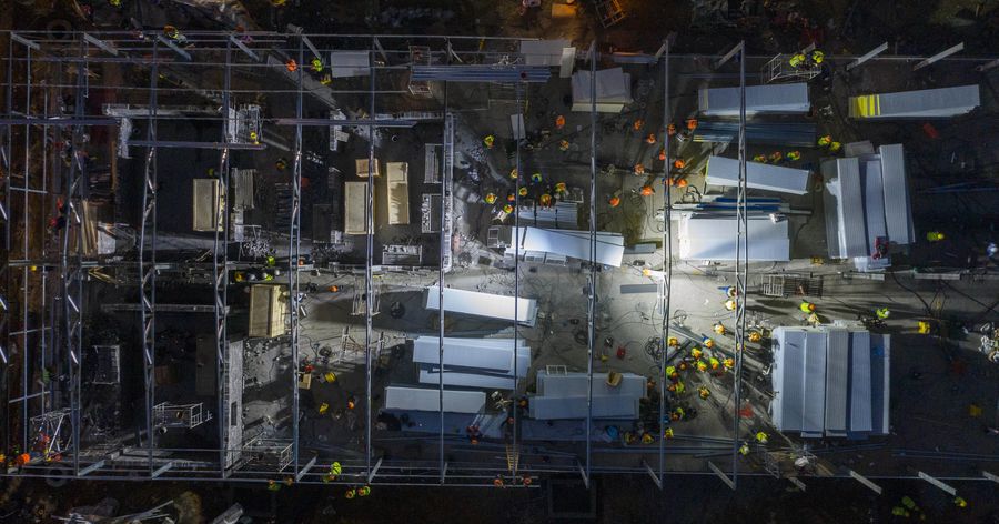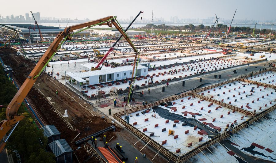 Aerial photo taken on Jan. 30, 2020 shows employees from China Construction Third Engineering Bureau Co., Ltd. working at the construction site of Huoshenshan (Fire God Mountain) Hospital in Wuhan, central China's Hubei Province. More than 4,000 workers and around 1,000 vehicles and large pieces of machinery have been toiling away at the hospital site day and night. The hospital is expected to be put into use on Feb. 3. (Xinhua/Cai Yang)