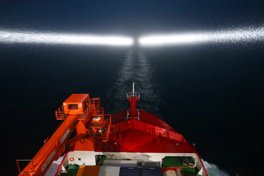 China's polar icebreaker Xuelong 2, or Snow Dragon 2, sails in the Southern Ocean before it crosses the prime meridian and enters the Western Hemisphere on Jan. 30, 2020. (Xinhua/Liu Shiping)■