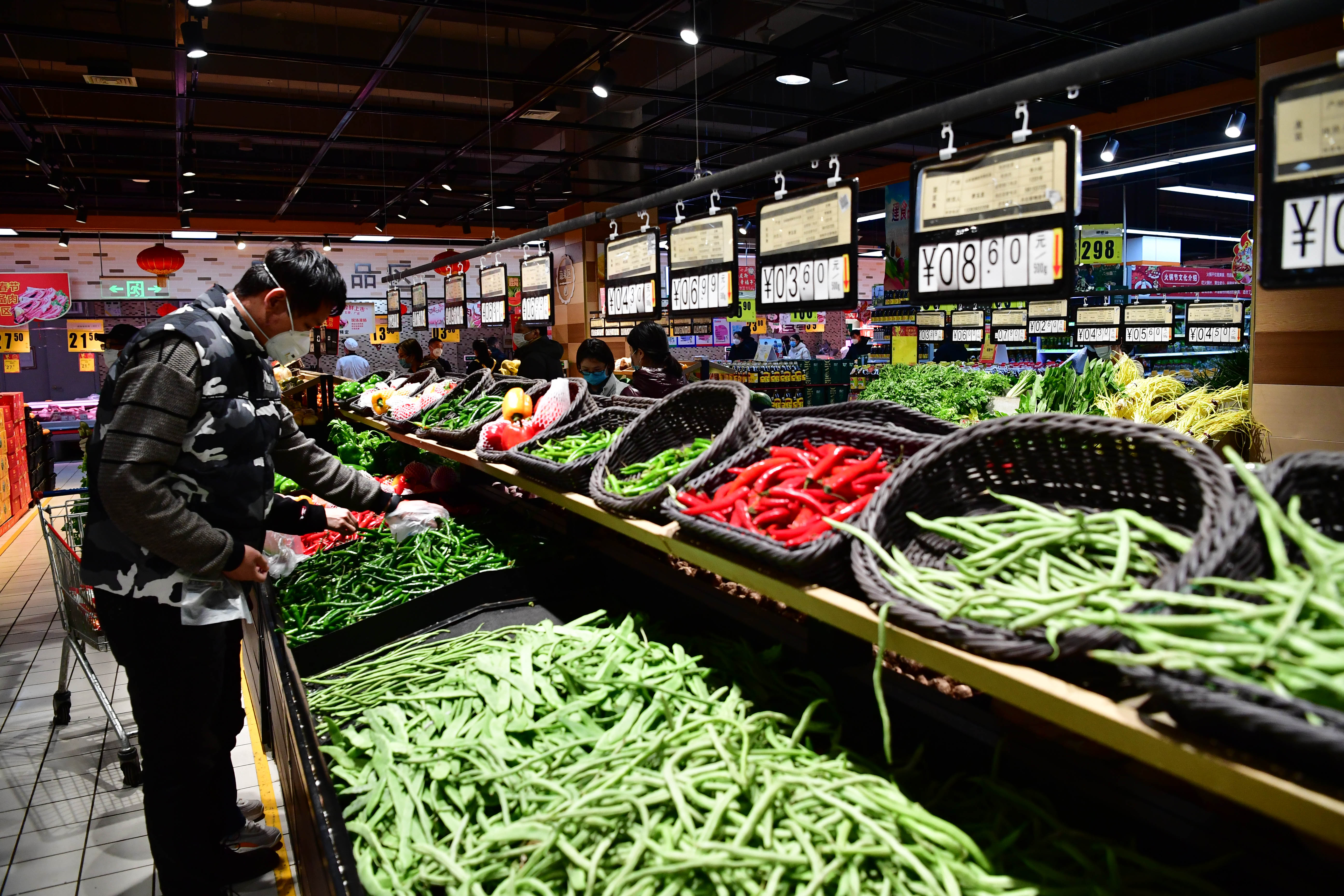 A citizen buys vegetables at a supermarket in Zhengzhou, central China's Henan Province, Jan. 30, 2020. (Xinhua/Feng Dapeng)