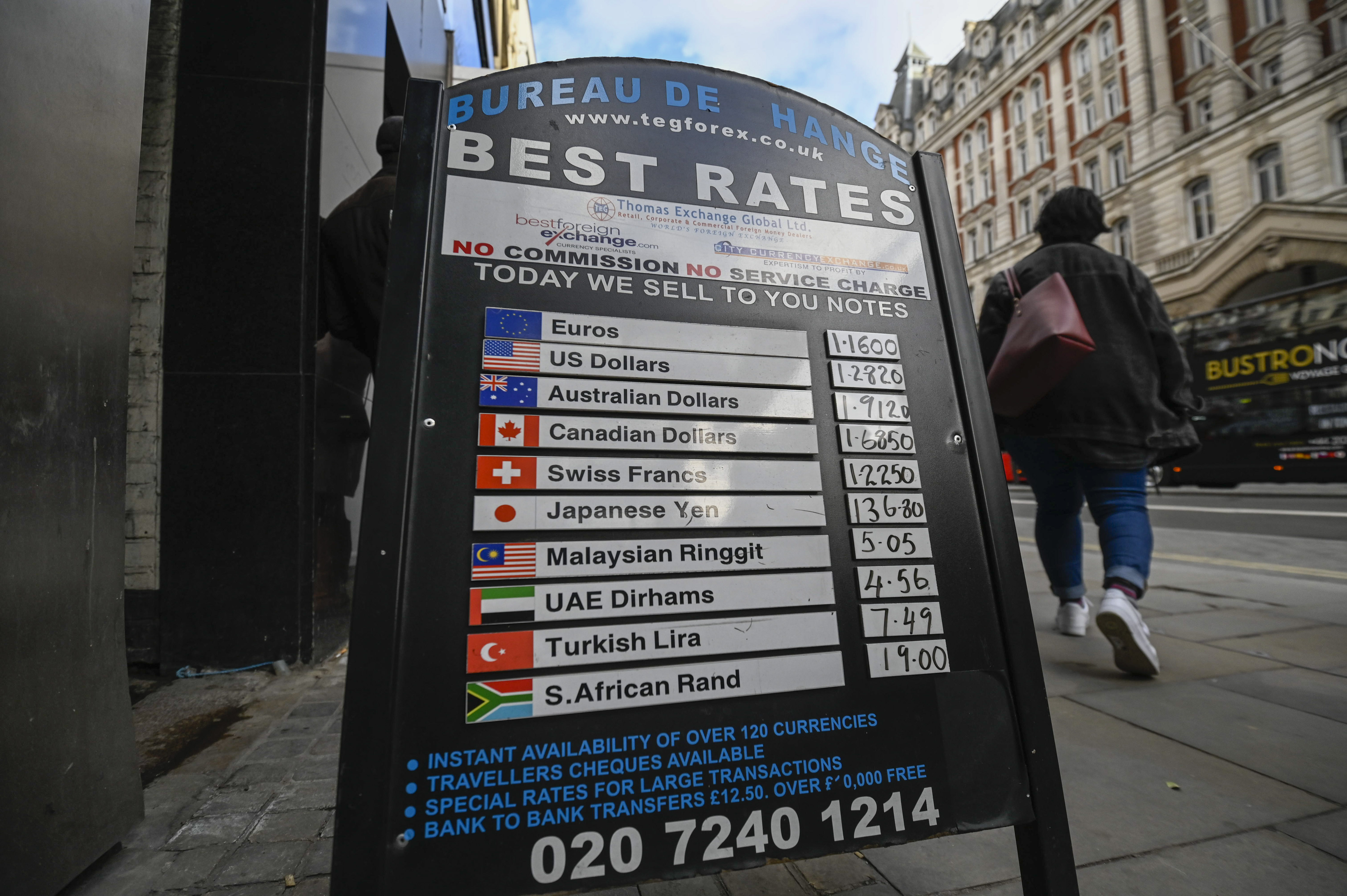 A pedestrian walks past a currency exchange in London, Britain, on Feb. 1, 2020.(Photo by Stephen Chung/Xinhua)