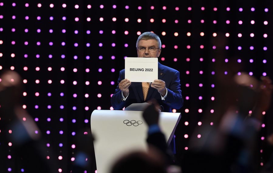 File photo taken on July 31, 2015 shows International Olympic Committee (IOC) president Thomas Bach shows the card with the name Beijing as the winning name of the 2022 Winter Olympic bid city, during the 128th International Olympic Committee (IOC) session in Kuala Lumpur, Malaysia. From sending athletes to Helsinki Summer Olympic Games for the very first time in 1952 to winning the bid to host 2022 Winter Olympic Games in 2015, the People's Republic of China went through a remarkable history of sports, including successfully hosting the 2008 Summer Olympic Games and preparing for the upcoming 2022 Winter Olympic Games. (Xinhua/Gong Lei)