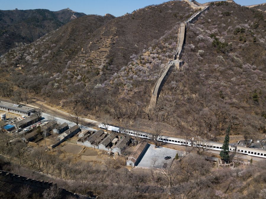 In this aerial photo taken on April 2, 2019, a Line S2 train of Beijing Suburban Railway (BSR) pulls out of Qinglongqiao station of the Beijing-Zhangjiakou railway in Beijing, capital of China. (Xinhua/Ju Huanzong)
