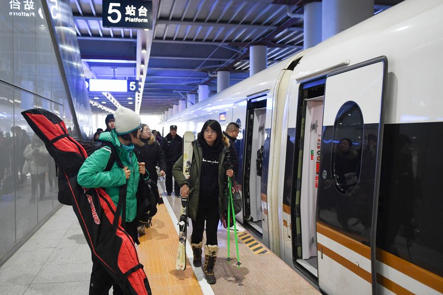 Xiao Zhen (R, front) holding ski boards and poles walks to take the high-speed train G8827 at a train station in Beijing, capital of China, Jan. 11, 2020. Xiao Zhen, a staff of a Beijing's internet company, has been keen on skiing for four years and always goes to the ski fields in Chongli district of Zhangjiakou city in north China's Hebei province. According to Xiao, She used to spend four to five hours thumbing a lift or taking a bus to Chongli from Beijing. The recent operation of the Beijing-Zhangjiakou high-speed railway line reduced the travel time to one hour now, bringing great convenience to Xiao's skiing trip to Chongli. (Xinhua/Ju Huanzong)