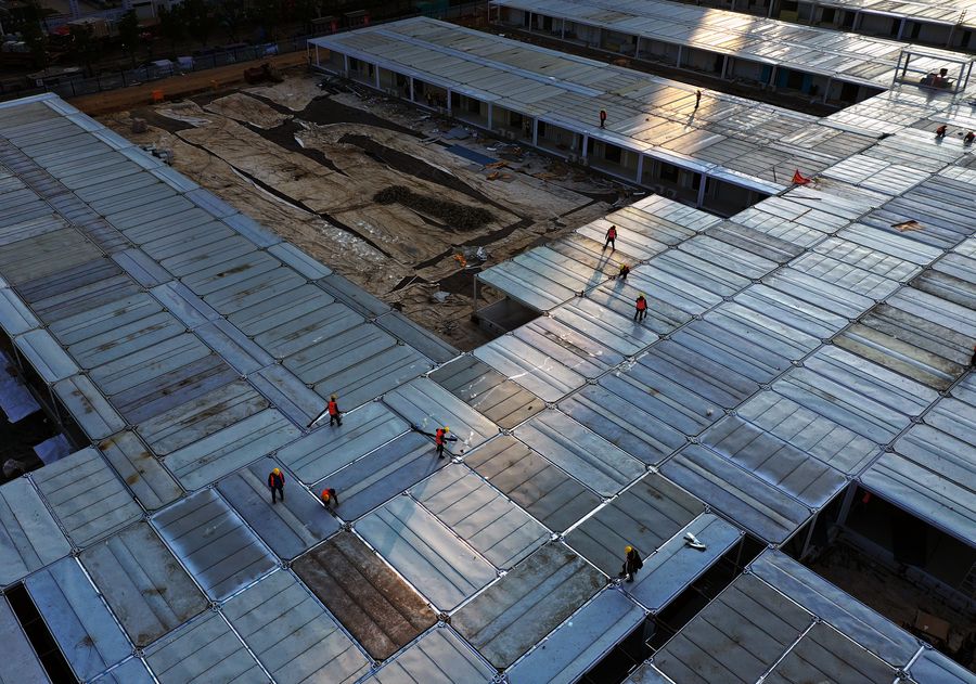 Aerial photo taken on Feb. 5, 2020 shows the construction site of the Leishenshan (Thunder God Mountain) Hospital in Wuhan, central China's Hubei Province. (Xinhua/Li He)
