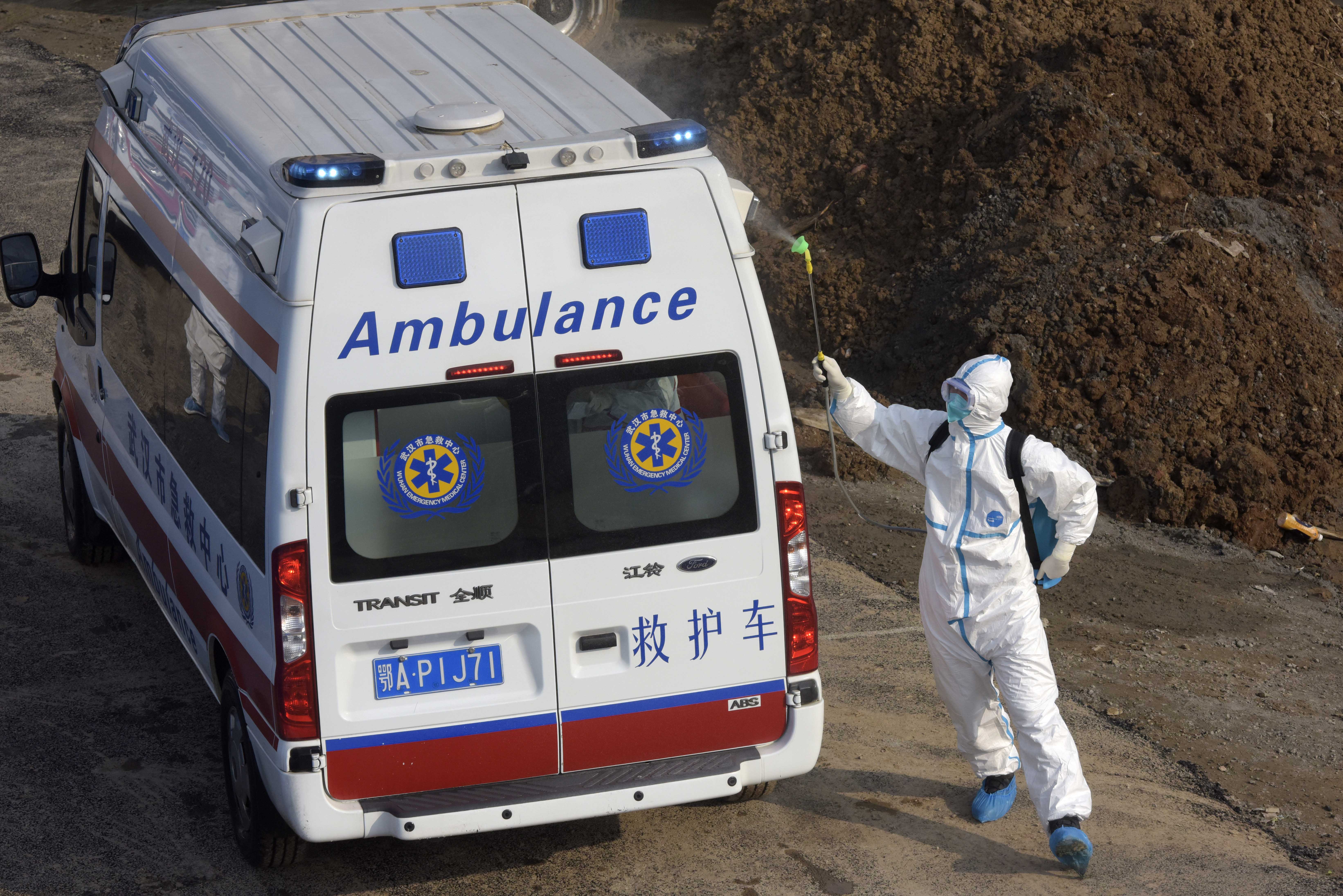 A staff member disinfects the ambulance transfering the first batch of patients infected with the novel coronavirus at Huoshenshan (Fire God Mountain) Hospital in Wuhan, central China's Hubei Province, Feb. 4, 2020. (Photo by Fan Xianhai/Xinhua)