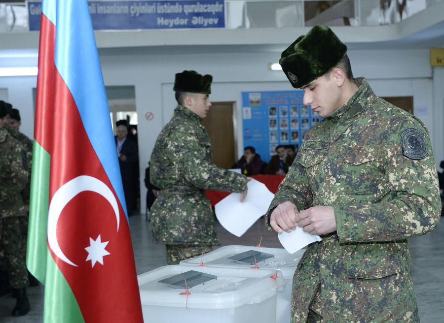 Azerbaijani soldiers cast their votes at a polling station in Baku, Azerbaijan, Feb. 9, 2020. (Photo by Tofik Babayev/Xinhua)