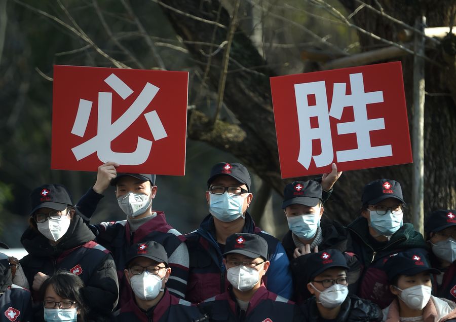 Medical team members hold banners meaning "Triumph" before leaving for Hubei Province, at Zhejiang Provincial People's Hospital in Hangzhou, capital of east China's Zhejiang Province, Feb. 9, 2020. (Xinhua/Han Chuanhao)
