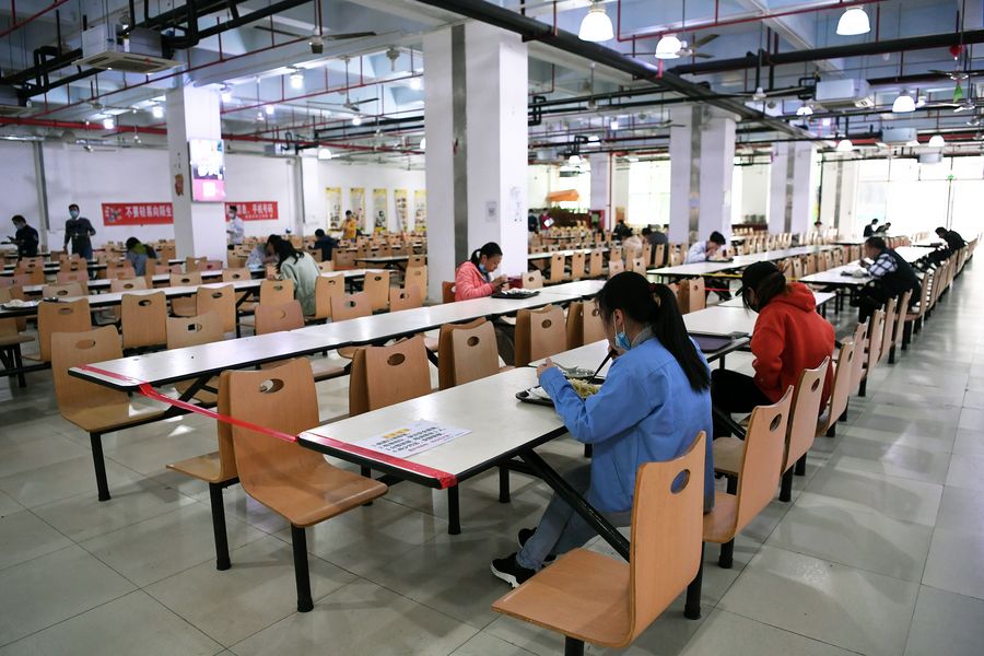 Workers eat at intervals as required at Hytera Industrial Park in Longgang District of Shenzhen, south China's Guangdong Province, Feb. 10, 2020. (Xinhua/Liang Xu)