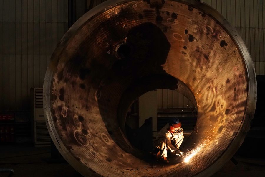 A worker works in a workshop of Harbin Boiler Company Limited in Harbin, northeast China's Heilongjiang Province, Feb. 10, 2020. Chinese authorities are carefully balancing efforts to control the novel coronavirus epidemic and minimize its impact on the economy as millions of people head back to work Monday after an extended holiday. (Xinhua/Wang Jianwei)