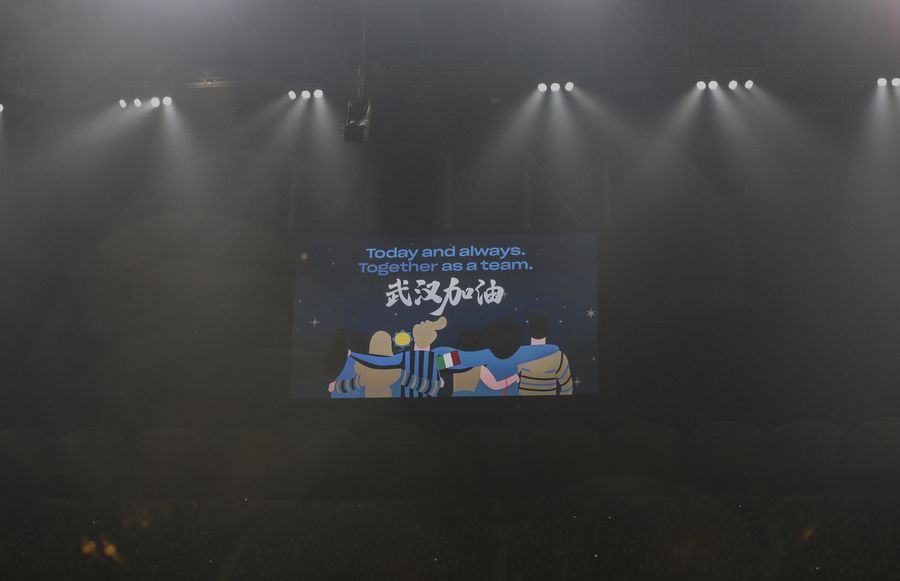 "Today and always. Together as a team. Forza Wuhan" is seen on the screen during a Serie A football match between FC Inter and AC Milan in Milan, Italy, Feb. 9, 2020. (Xinhua/Cheng Tingting)