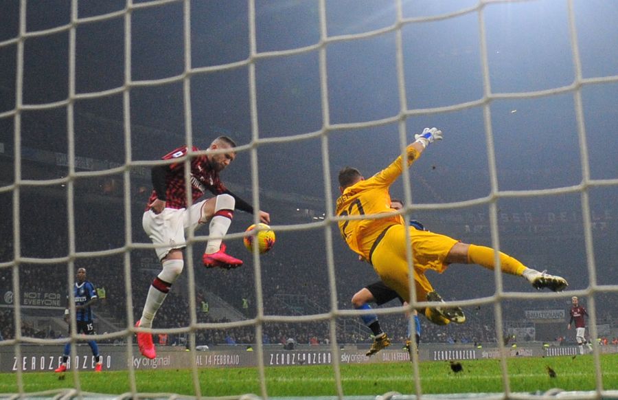 AC Milan's Ante Rebic (L) scores during a Serie A football match between FC Inter and AC Milan in Milan, Italy, Feb. 9, 2020. (Photo by Alberto Lingria/Xinhua)