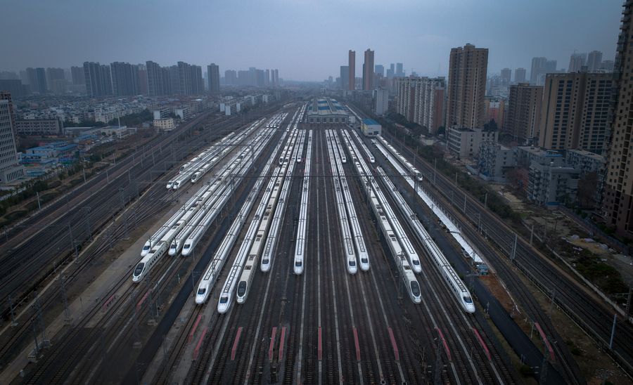 Aerial photo taken on Feb. 10, 2020 shows the parked trains in Wuhan, central China's Hubei Province. (Xinhua/Xiao Yijiu)
