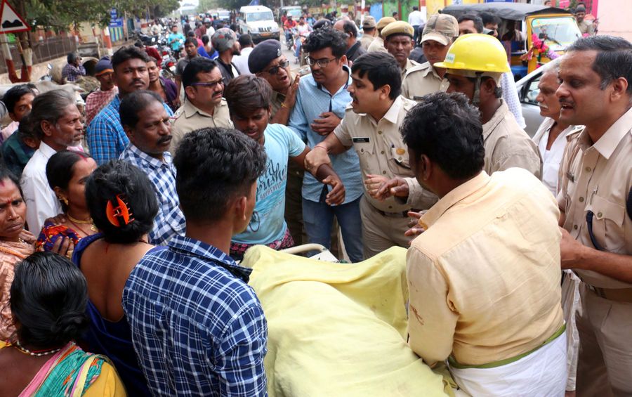 People transfer the body of a victim in Ganjam District of India's eastern state of Odisha, Feb. 9, 2020. At least nine people died of electrocution and 22 others were injured in India's eastern state of Odisha when a moving bus came in contact with an 11 KV live transmission wire on Sunday. (Xinhua)