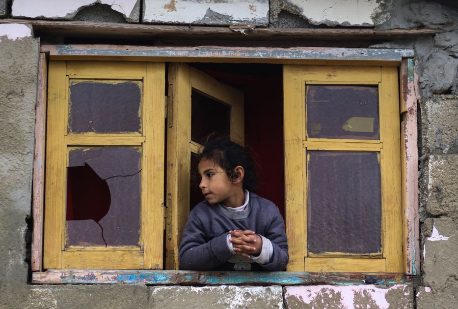A Palestinian girl looks out from her house at a poor neighborhood in southern Gaza Strip city of Khan Younis, Feb. 10, 2020. (Photo by Yasser Qudih/Xinhua)