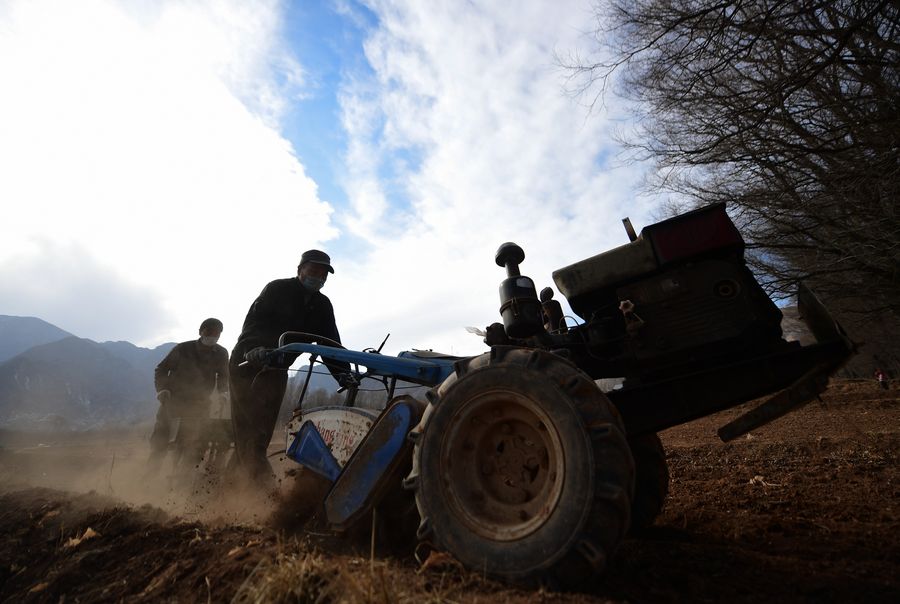 Villagers plough and sow in the field in Heyan Village of Minhe County, northwest China's Qinghai Province, Feb. 10, 2020. (Xinhua/Zhang Long)