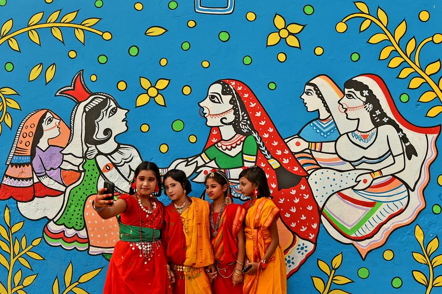 Girls take selfie in front of a wall with colorful decorations during a folk arts festival and fair in Sonargaon on the outskirts of capital Dhaka, Bangladesh, on Feb. 9, 2020. (Str/Xinhua)■