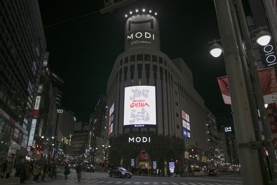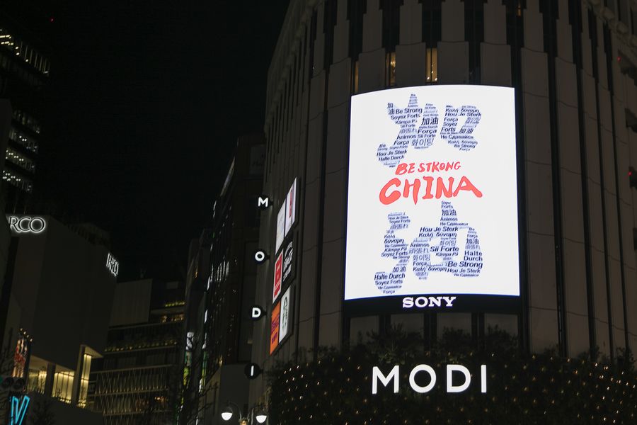 A digital billboard showing "Be Strong China", conveying support to China in fighting the novel coronavirus epidemic, is seen at Shibuya in Tokyo, Japan, Feb. 10, 2020. (Xinhua/Du Xiaoyi)