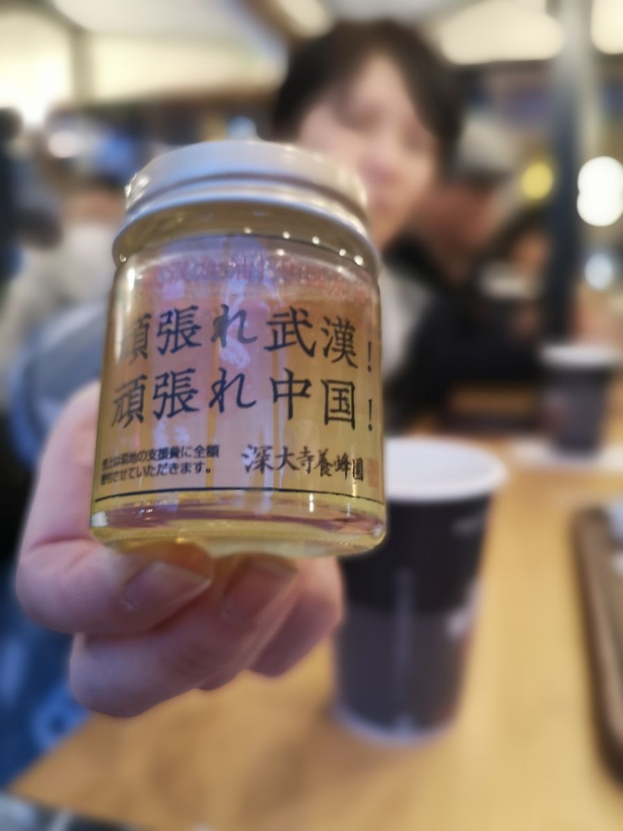Japanese "Be Strong China" and "Be strong, Wuhan" are seen on a honey bottle at a stall in Ikebukuro, Tokyo, Japan, Feb. 8, 2020. (Xinhua)