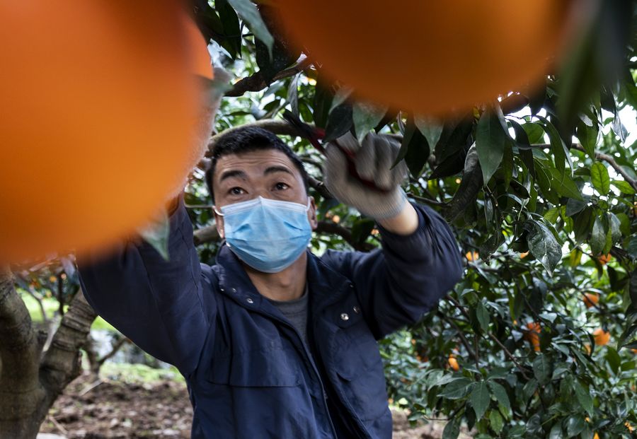 A villager picks oranges in Xilingxia Village of Quyuan Township in Zigui County of Yichang, central China's Hubei Province, Feb. 11, 2020. (Photo by Xiang Hongmei/Xinhua)