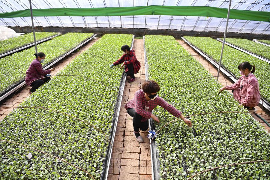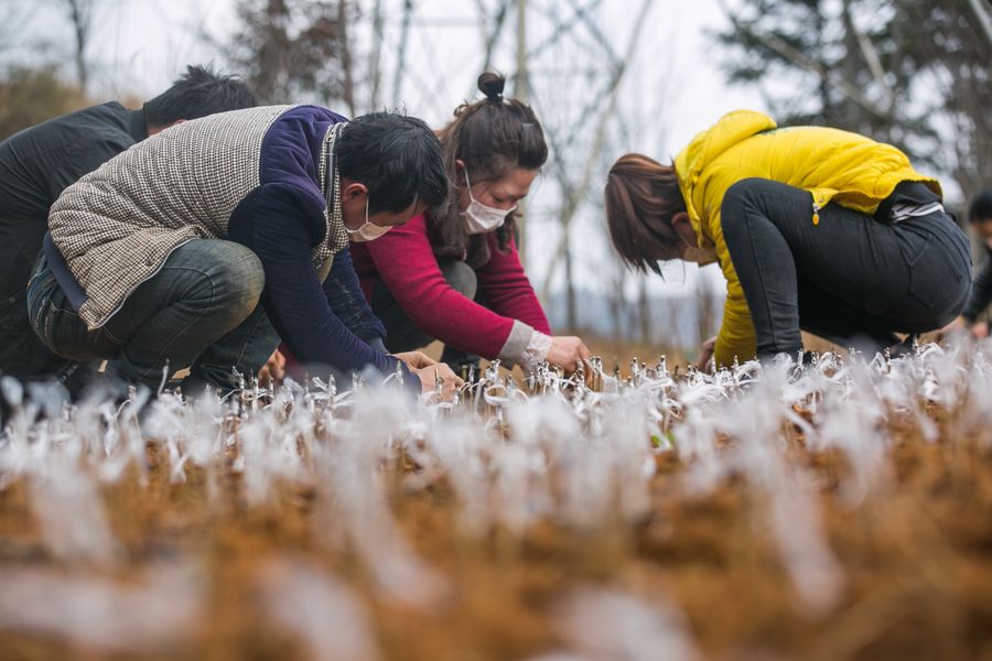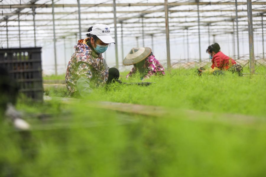 People work in a greenhouse of medical herb in Xingren Township of Danzhai County, Miao and Dong Autonomous Prefecture of Qiandongnan, southwest China's Guizhou Province, Feb. 11, 2020. (Photo by Huang Xiaohai/Xinhua)