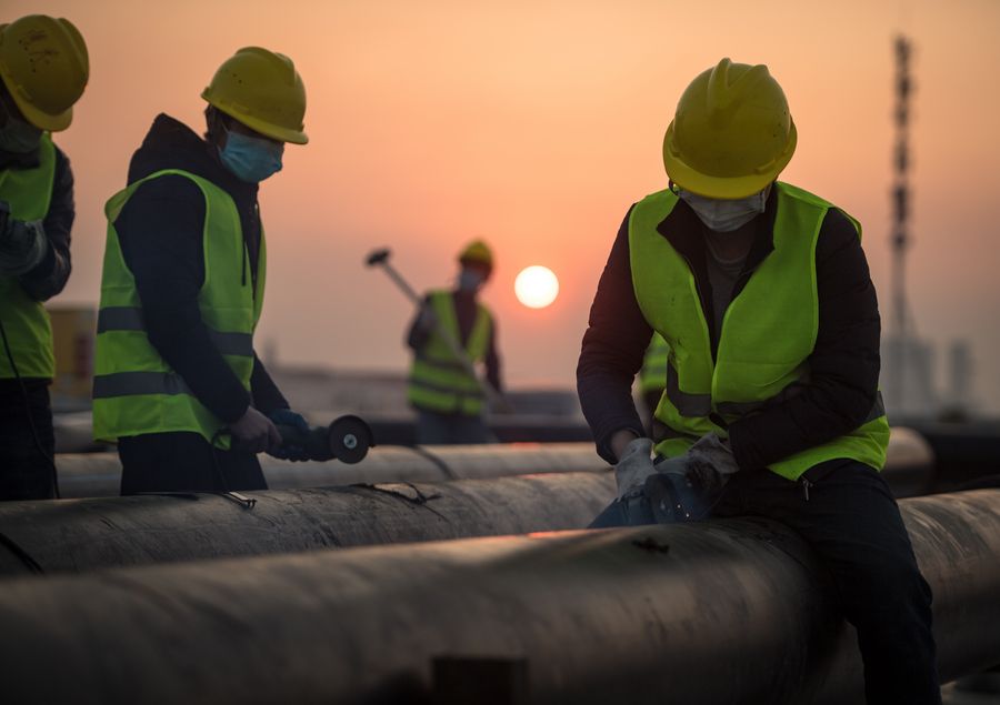 Workers work at the construction site of Leishenshan Hospital, one of the makeshift hospitals to treat pneumonia patients infected with the novel coronavirus, in Wuhan, central China's Hubei Province, Feb. 4, 2020. (Xinhua/Xiao Yijiu)