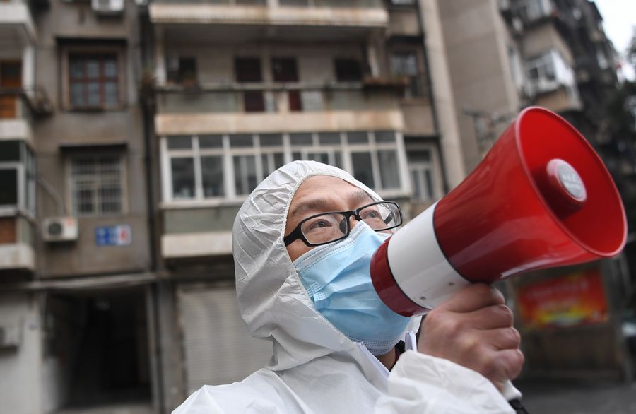 A community worker informs residents of a health check in Caidian District of Wuhan, the epicenter of the novel coronavirus outbreak, central China's Hubei Province, Feb. 7, 2020. (Xinhua/Cheng Min)