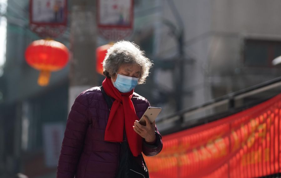 A resident checks information sent by community on her phone in Wuchang District of Wuhan, the epicenter of the novel coronavirus outbreak in central China's Hubei Province, Feb. 9, 2020. (Xinhua/Cheng Min)
