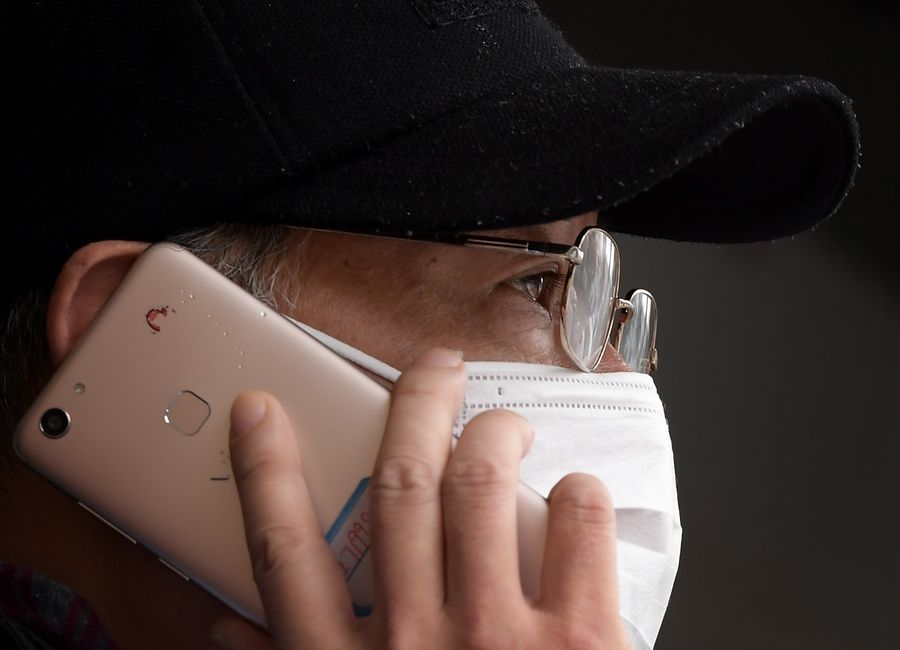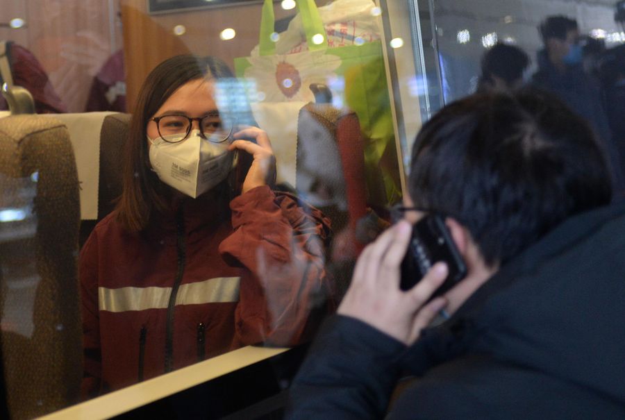 A medical team member (L) of the Second Xiangya Hospital of Central South University says goodbye to her family member via mobile phone before setting off for Wuhan, central China's Hubei Province, at Changsha South Railway Station in Changsha, central China's Hunan Province, Feb. 8, 2020. (Xinhua/Chen Zhenhai)