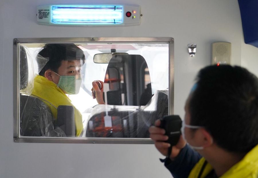 A staff member tests the UV light and intercom of a negative pressure ambulance at a special-purpose vehicle company to meet the needs of hospitals in the prevention and control of the novel coronavirus pneumonia epidemic in Xi'an, northwest China's Shaanxi Province, Feb. 10, 2020. (Xinhua/Shao Rui)