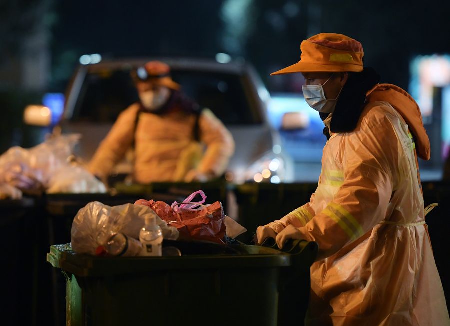 Sanitation workers who have been sticking to their posts clean up the garbage at a community at night in Wuhan, central China's Hubei Province, Feb. 1, 2020. (Xinhua/Li He)