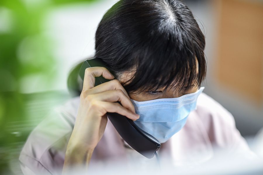 A medical specialist answers telephone calls through the government service hotline "12345" to provide consultation service on prevention and treatment of novel coronavirus pneumonia for citizens in Haikou, south China's Hainan province, Feb. 8, 2020. (Photo by Pu Xiaoxu/Xinhua)