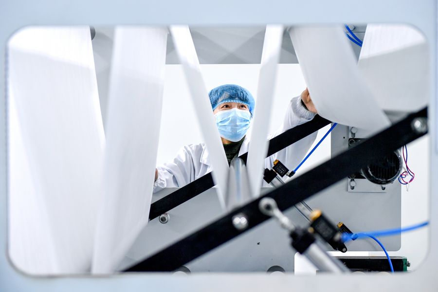 A medical technology company staff works beside a surgical dressing production line in Changxing County of Huzhou, east China's Zhejiang Province, Feb. 6, 2020. (Photo by Tan Yunfeng/Xinhua)