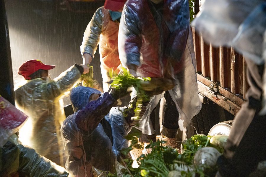 Voluntary workers load donated vegetables onto a truck which will head for Wuhan to help the city fight the outbreak of the novel coronavirus pneumonia in the rain in Yibin City, southwest China's Sichuan Province, Feb. 2, 2020. (Photo by Peng Minxiang/Xinhua)