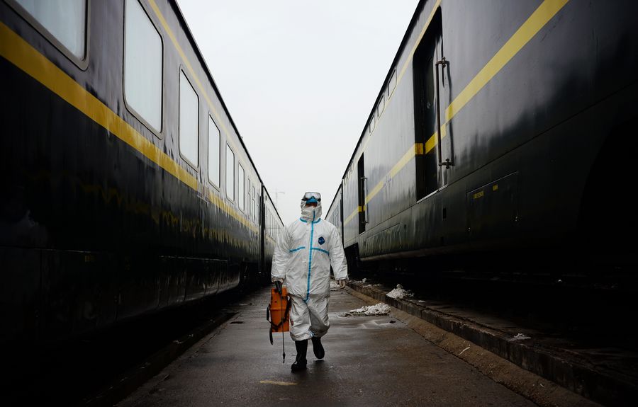 A staff member of China Railway Xi'an Group Co., Ltd prepares to conduct disinfection work for a train to curb the spread of the novel coronavirus in Xi'an, northwest China's Shaanxi Province, Feb. 6, 2020. (Xinhua/Liu Xiao)