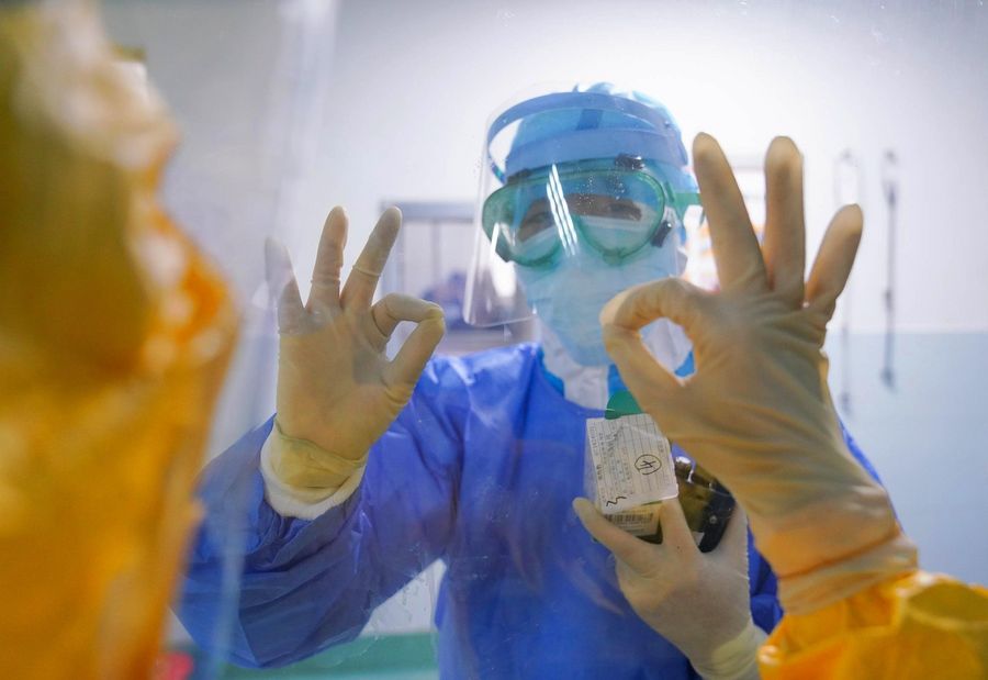 Medical workers gesture to each other through the window in Zhangzhou Municipal Hospital in Zhangzhou, southeast China's Fujian Province, Feb. 2, 2020. (Photo by Xiao Heyong/Xinhua)