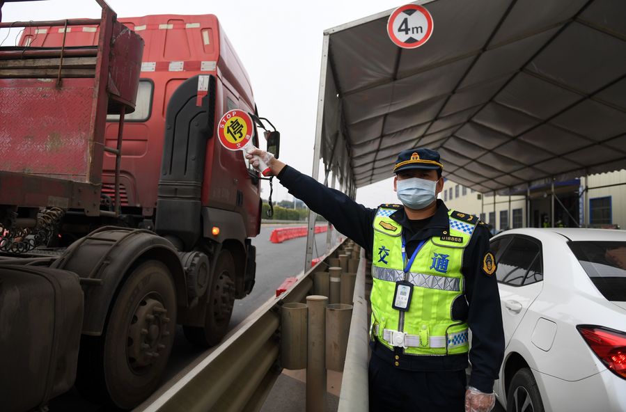 A staff member guides cars to stop by road to measure body temperatures for drivers near a highway toll station to better fight against the epidemic in Nanning, south China's Guangxi Zhuang Autonomous Region, Feb. 1, 2020. (Xinhua/Lu Boan)