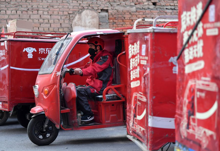 Deliveryman Xu Guobin who has continued to work during the Spring Festival holidays for straight 12 days prepares to delivering packages to the people who needed them in Xi'an, northwest China's Shaanxi Province, Feb. 3, 2020. (Xinhua/Liu Xiao)■